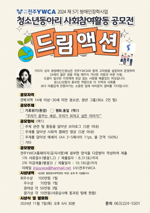 2024 제5기 방애인장학사업 [청소년동아리 사회참여활동 공모전-드림,액션!] 참가자모집