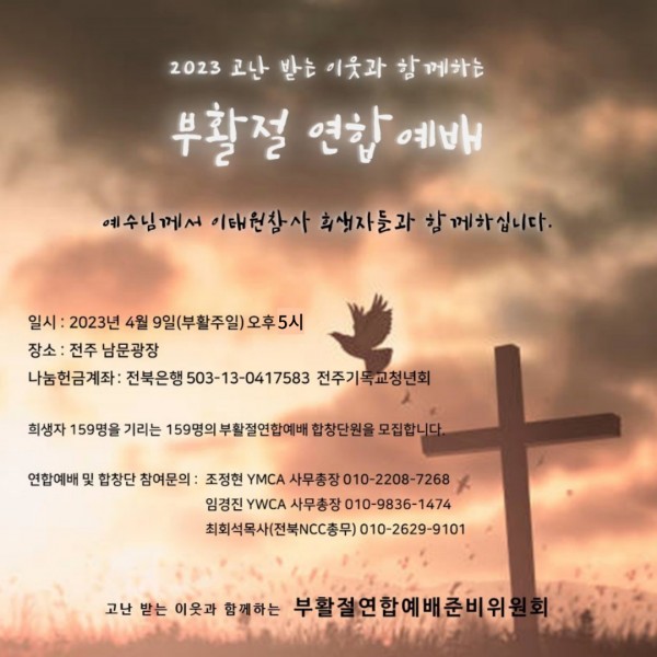 올해 고난받은 이들과 함께하는 부활절 연합예배는 ‘이태원 참사에 희생된 유가족과 함께합니다.’ 남문광장의 이태원참사 희생자 분향소를 보며 늘 미안하고 마음이 무거웠습니다.