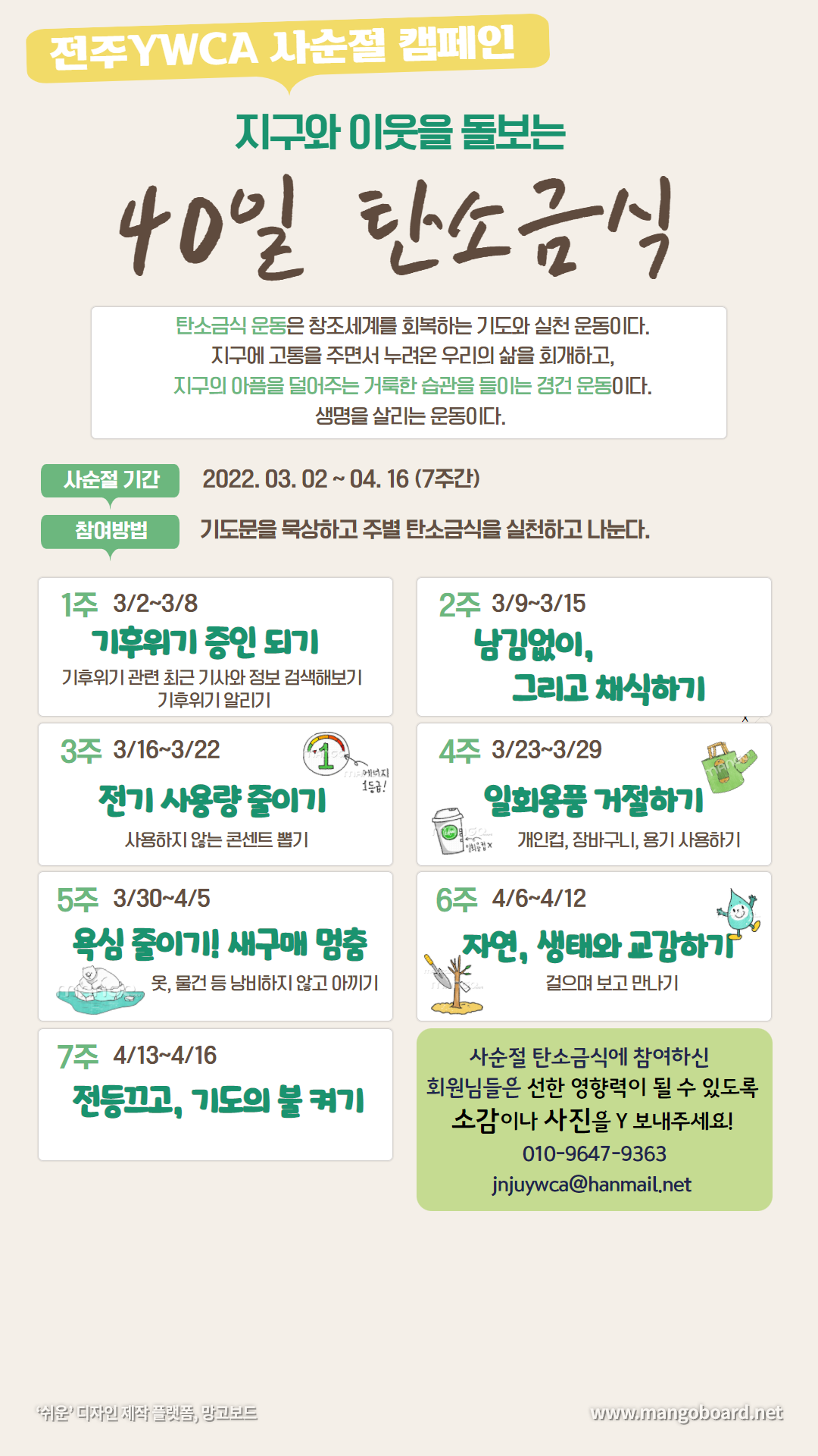 공지사항 2022 지구와 이웃을 돌보는 "40일 탄소금식" 작성자관리자 등록일22-03-17 14:15 조회수379 지구를 살리고 이웃을 살리는 생명운동 "40일 탄소금식"에 함께해주세요회원님들의 많은 참여 부탁드립니다.! 본문 목록 다음글 한국YWCA 창립 100주년 기념식 22.04.05 이전글 22년 신규 전라북도청소년유해환경감시단원 모집 22.02.16 댓글 (0) 댓글목록 등록된 댓글이 없습니다.