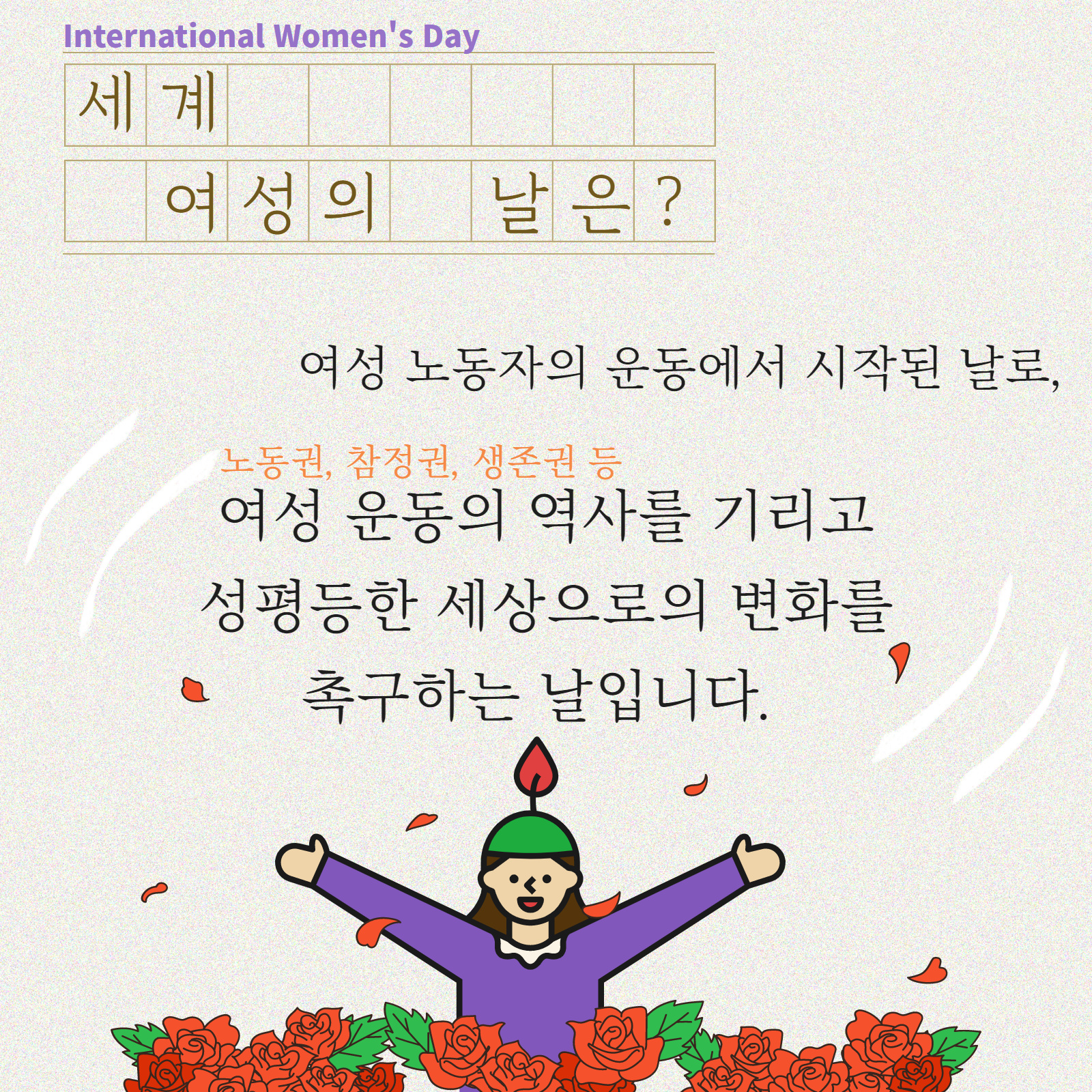 공지사항 2021년 세계 여성의 날을 위한 YWCA캠페인 작성자관리자 등록일21-03-08 16:01 조회수295 매년 3월 8일 세계 여성의 날은 여성들의 노동권과 참정권을 비롯한 권리 신장을 위한 기념일로서 성평등한 세상으로의 변화를 촉구하는 날입니다. 본문 목록 다음글 미얀마 지지를 위한 한국YWCA 성명서 한글 21.03.15 이전글 2021년 전라북도청소년유해환경감시단 모집 21.02.19 댓글 (0) 댓글목록 등록된 댓글이 없습니다.