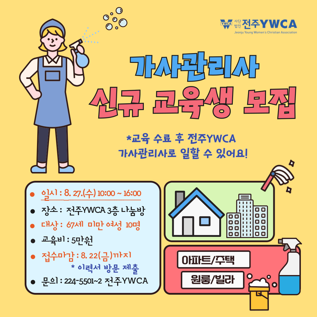 공지사항 가사관리사 신규교육생 모집 작성자관리자 등록일25-08-11 11:42 조회수222 *접수문의 : 전주YWCA 063-224-5501~2*제출서류 : (상담) 이력서,주민등록등본, 건강검진 확인서 본문 목록 다음글 전주여성인력개발센터 직원채용 공고 25.08.29 이전글 전주여성인력개발센터 직원채용 공고 25.08.05 댓글 (0) 댓글목록 등록된 댓글이 없습니다.
