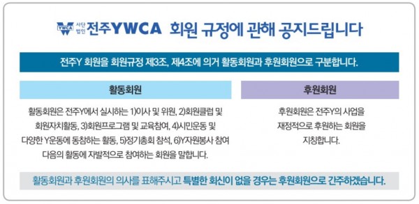 전주YWCA 회원을 회원규정 제3조, 제4조에 의거 활동회원과 후원회원으로 구분합니다.