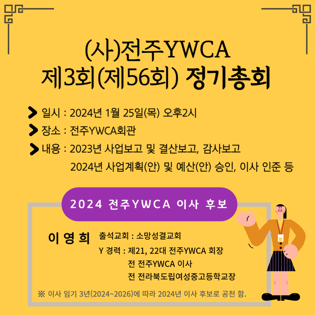 공지사항 (사)전주YWCA 제3회(제56회) 정기총회, 2024년 이사후보 안내 작성자관리자 등록일24-01-03 13:06 조회수278 (사)전주YWCA 제3회(제56회) 정기총회 - 일시 : 2024. 1. 25(목) 오후2시- 장소 : 전주YWCA회관 본문 목록 다음글 2023 기부금영수증 발급안내 24.01.04 이전글 살림돌보미 신규교육 안내 23.09.01 댓글 (0) 댓글목록 등록된 댓글이 없습니다.