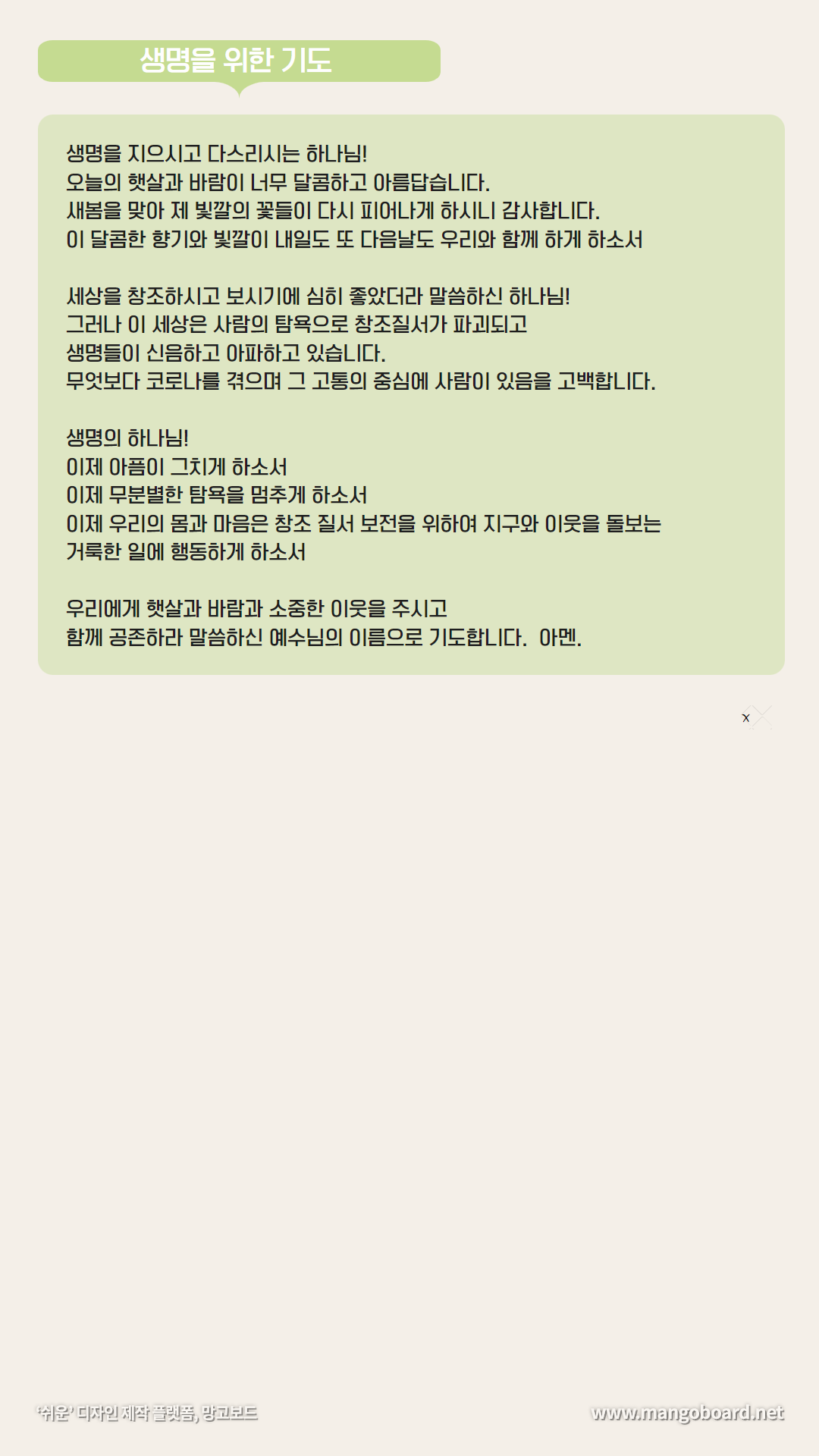 공지사항 2022 지구와 이웃을 돌보는 "40일 탄소금식" 작성자관리자 등록일22-03-17 14:15 조회수378 지구를 살리고 이웃을 살리는 생명운동 "40일 탄소금식"에 함께해주세요회원님들의 많은 참여 부탁드립니다.! 본문 목록 다음글 한국YWCA 창립 100주년 기념식 22.04.05 이전글 22년 신규 전라북도청소년유해환경감시단원 모집 22.02.16 댓글 (0) 댓글목록 등록된 댓글이 없습니다.