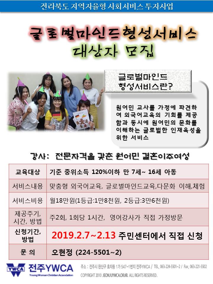 공지사항 글로벌마인드형성서비스 대상자 모집 작성자관리자 등록일19-01-22 14:19 조회수347 글로벌마인드형성서비스 대상자 모집 본문 목록 다음글 전라북도청소년유해환경감시단원 모집 19.07.30 이전글 전주YWCA Y-틴 청소년 모집 15.03.02 댓글 (0) 댓글목록 등록된 댓글이 없습니다.