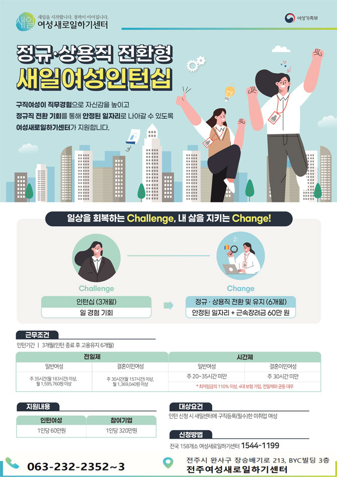 공지사항 정규·상용직 전환형 새일여성인턴십 작성자관리자 등록일21-04-20 15:08 조회수343 정규·상용직 전환형 새일여성인턴십 본문 목록 다음글 새일여성인턴십 참여 사업장 모집 21.04.20 이전글 2021년 경력단절예방지원사업 동아리 모집안내 21.04.19 댓글 (0) 댓글목록 등록된 댓글이 없습니다.