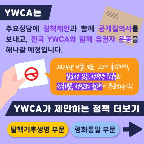 프로그램안내 한국YWCA가 제안하는 성평등 정책 작성자관리자 등록일24-03-13 14:47 조회수282 2024년 4월 10일, 22대 총선!우리는 이런 정책에 투표하겠습니다. 정책 본문 목록 다음글 한국YWCA가 제안하는 평화통일 정책 24.03.13 이전글 한국YWCA가 제안하는 탈핵기후생명 정책 24.03.13 댓글 (0) 댓글목록 등록된 댓글이 없습니다.