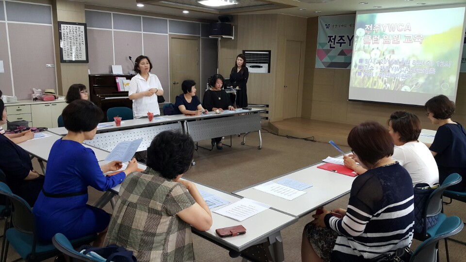 전주YWCA 회원부에서는 6월 8일(수) “2016년 전주YWCA 성인클럽임원 지도력 훈련”을 진행하였다. 이번 클럽임원 지도력 훈련은 예배를 통한 영성훈련, 전주Y 회원부 이영희 위원장의 환영사를 시작으로 각 클럽 임원들과의 인사의 시간을 가졌다. 각 클럽 소개, YWCA 운동중점 및 활동 소개, 거리의 성자 ‘방애인 선생’ 이야기 등 전주Y 회원활동 강화를 위한 제안이라는 주제로 앞으로 전주Y 회원활동에 긍정적인 변화를 가질 수 있도록 힘을 얻는 값진 시간이었다.