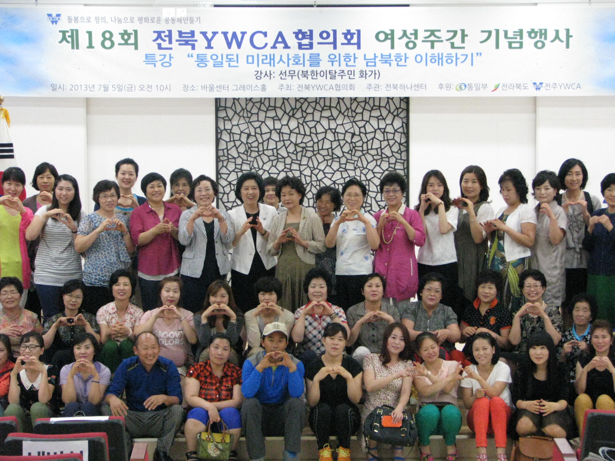 전주YWCA는 제18회 여성주간을 맞이하여 지난 7월 5일 금요일 오전 10시 전주바울교회 바울센터 그레이스홀에서 '통일된 미래사회를 위한 남북한 이해하기'라는 주제로 북에서 내려와 한국에 정착해 살고 있는 화가 선무의 특강과 북한이탈주민의 ‘나의 정착이야기 및 특별공연’이 이어졌다.
