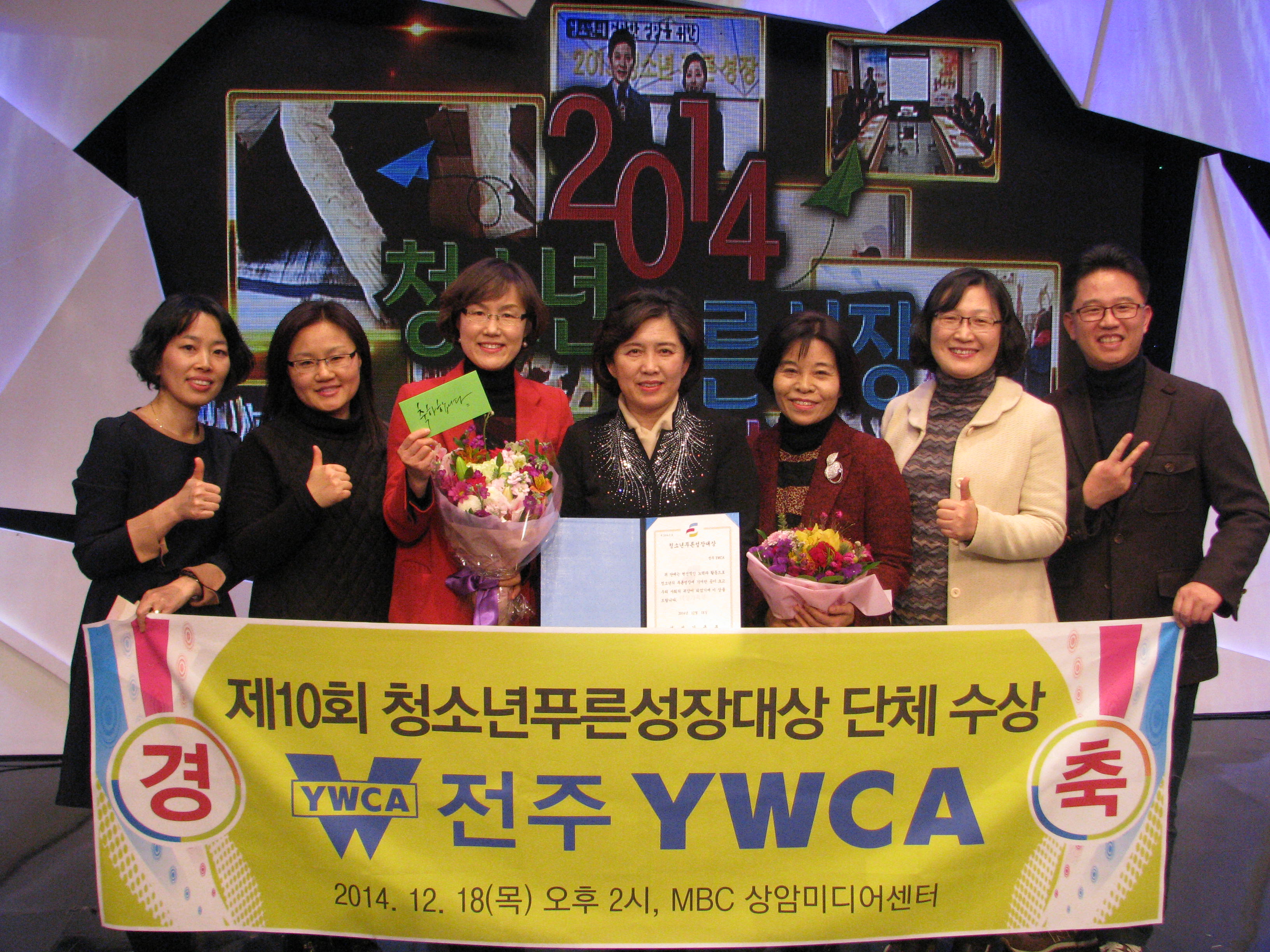 YWCA활동 제10회 청소년푸른성장대상 단체부분 수상 작성자관리자 등록일15-02-02 10:40 조회수1,317 전주YWCA가 청소년보호육성공로를 인정받아 지난 제10회 청소년푸른성장대상에서 단체부문에 선정되었다. 축하해 주세요~ 본문 목록 다음글 전국17개 시도 감시단중 전주YWCA청소년유해환경감시단 '최우수상' 수상 15.02.02 이전글 쉴토지원사업-미술치료 '마음을 열자! 손바닥을 펼쳐라!!' 14.12.02 댓글 (1) 댓글목록 관리자님의 댓글 관리자 작성일 15-02-02 10:41 2014.12.18 오후1:50분 MBC 방영 "청소년푸른성장대상 시상식" 2014.12.18 오후1:50분 MBC 방영 "청소년푸른성장대상 시상식" 댓글 옵션