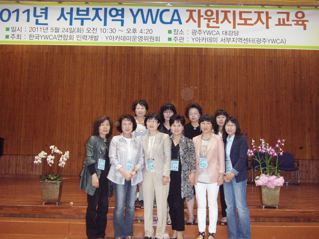 한국YWCA연합회 인력개발, Y아카데미 운영위원회가 주최하고 Y아카데미 서부지역센터가 주관하는 ‘2011년 서부지역YWCA 자원지도자 교육’이 5월 24(화) 광주YWCA에서 진행되었다. YWCA정체성과 역사 이해, YWCA 운동중점과 주력운동 이해, YWCA구조 이해, 자원지도자(이사·위원)의 역할을 이해하기 위한 목적으로 전주YWCA에서는 이사, 위원, 실무자 10명이 참가하여 찬양으로 하나되고 자원지도자의 역할을 찾고 지도력을 향상하며 다짐하는 시간이 되었다.