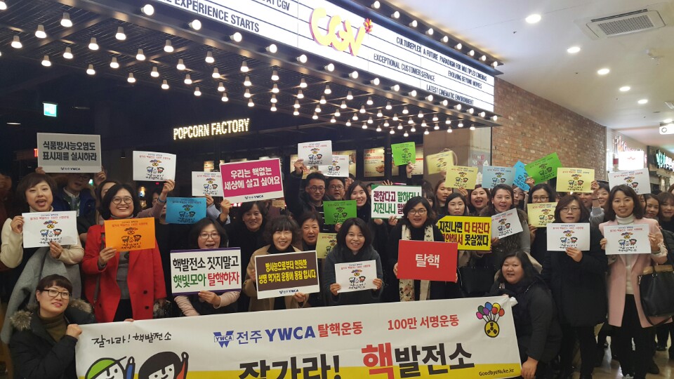 YWCA활동 잘가라 핵발전소 캠페인 작성자관리자 등록일17-02-15 13:21 조회수465 - 일시 : 2016. 12. 31- 장소 : CGV 효자점- 내용 : 잘가라 핵발전소 캠페인 전개 본문 목록 다음글 농산물명예감시원 교육 17.02.15 이전글 생명사랑 밤길 걷기대회 17.02.15 댓글 (0) 댓글목록 등록된 댓글이 없습니다.