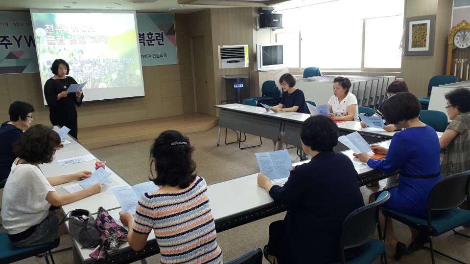 전주YWCA 회원부에서는 6월 8일(수) “2016년 전주YWCA 성인클럽임원 지도력 훈련”을 진행하였다. 이번 클럽임원 지도력 훈련은 예배를 통한 영성훈련, 전주Y 회원부 이영희 위원장의 환영사를 시작으로 각 클럽 임원들과의 인사의 시간을 가졌다. 각 클럽 소개, YWCA 운동중점 및 활동 소개, 거리의 성자 ‘방애인 선생’ 이야기 등 전주Y 회원활동 강화를 위한 제안이라는 주제로 앞으로 전주Y 회원활동에 긍정적인 변화를 가질 수 있도록 힘을 얻는 값진 시간이었다.