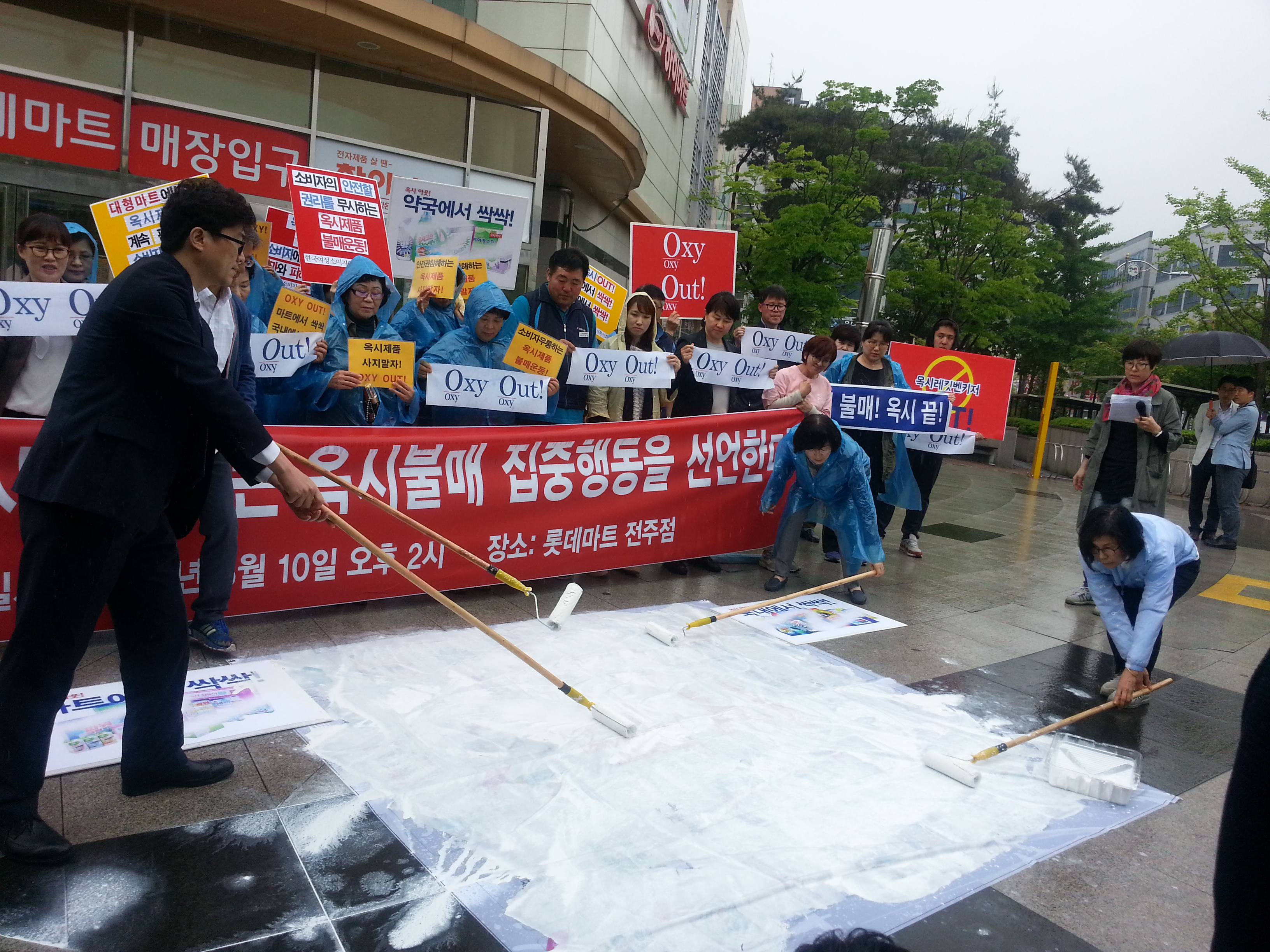 롯데마트 전주점에서 집중행동기간 실천 활동 내용을 발표하고 옥시퇴출 퍼포먼스에 동참함.