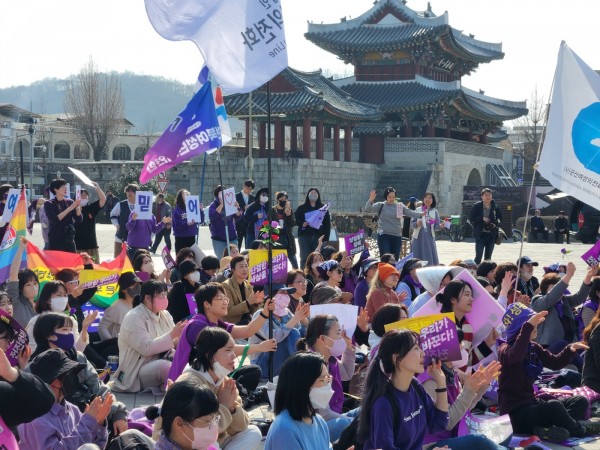 성평등에 대한 사회 전반의 백래시와 정부 주도로 ‘여성’과 ‘성평등’이 삭제되는 퇴행의 시대 한 가운데를 함께 살아가고 있는 페미니스트 시민 여러분. 그럼에도 불구하고 우리는 명백히 존재하는 성차별과 폭력의 경험과 현실을 드러내고, 함께하는 서로의 얼굴을 확인하며, 더욱 거세게 성평등 사회로의 변화를 촉구하고자 오늘 이 자리에 모였습니다.